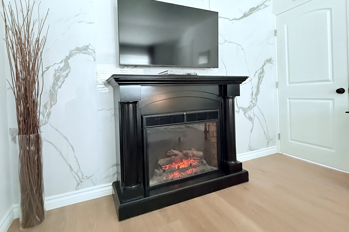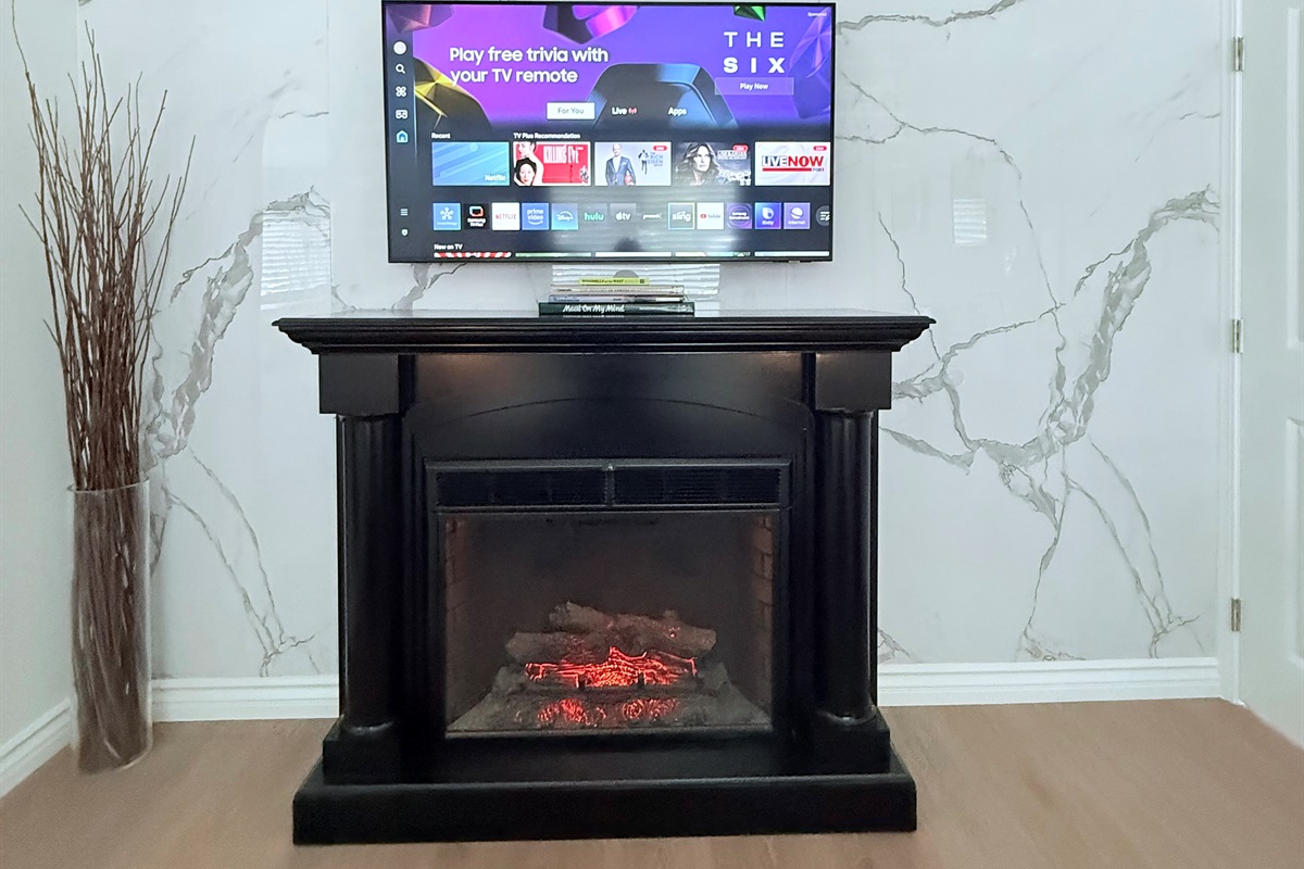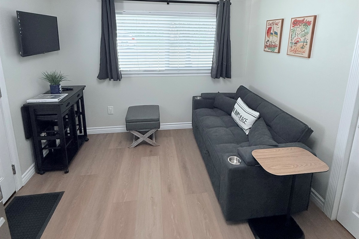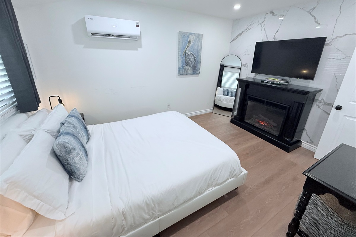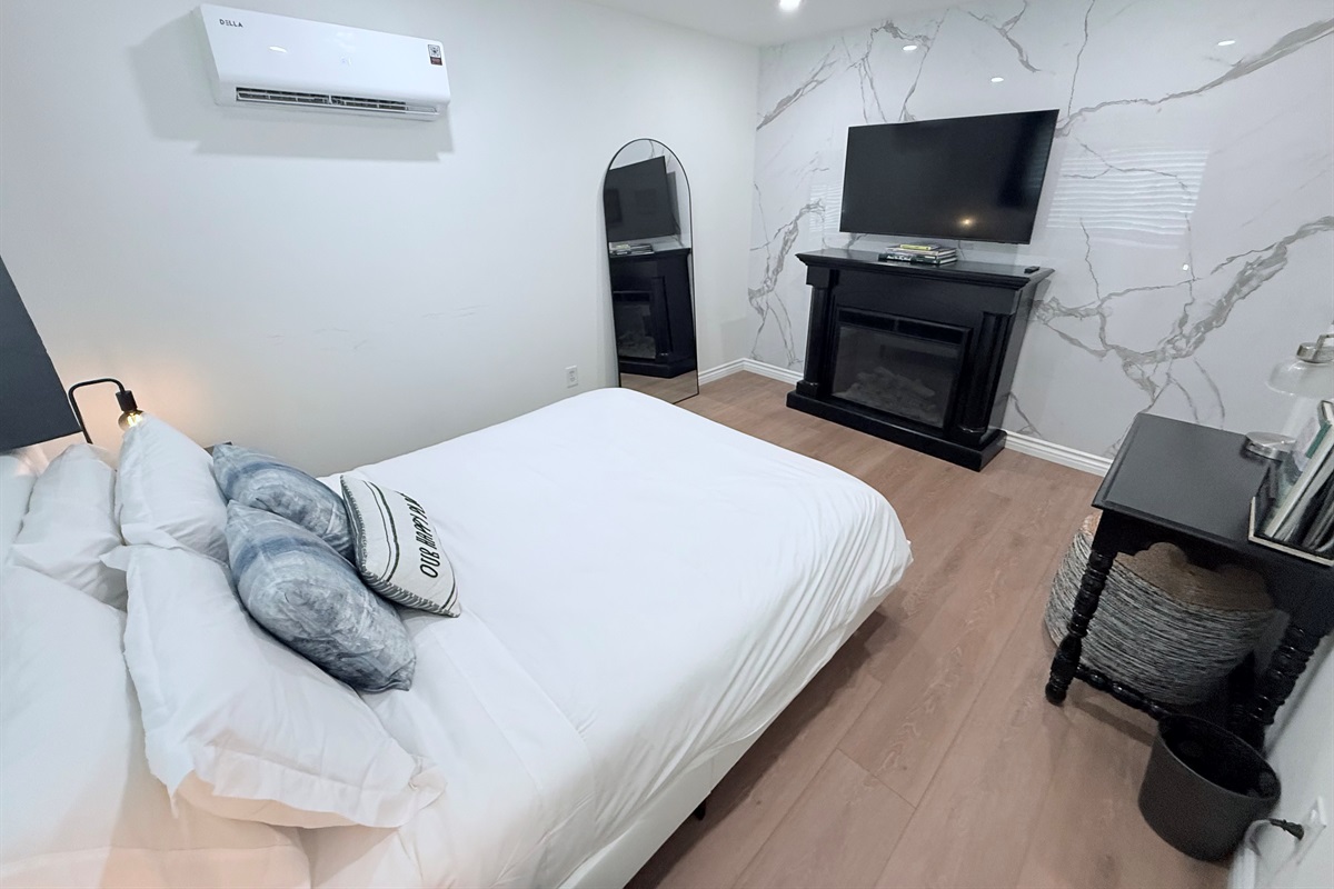 Inside, enjoy a fully stocked kitchen, cozy fireplace, fast Wi-Fi, and smart TVs in both the living room and bedroom. The spacious bedroom features a plush queen bed, while the living area offers a pull-out sofa, perfect for couples, small families, or business travelers. The modern bathroom boasts a sleek, curb-less walk-in shower for a touch of luxury.