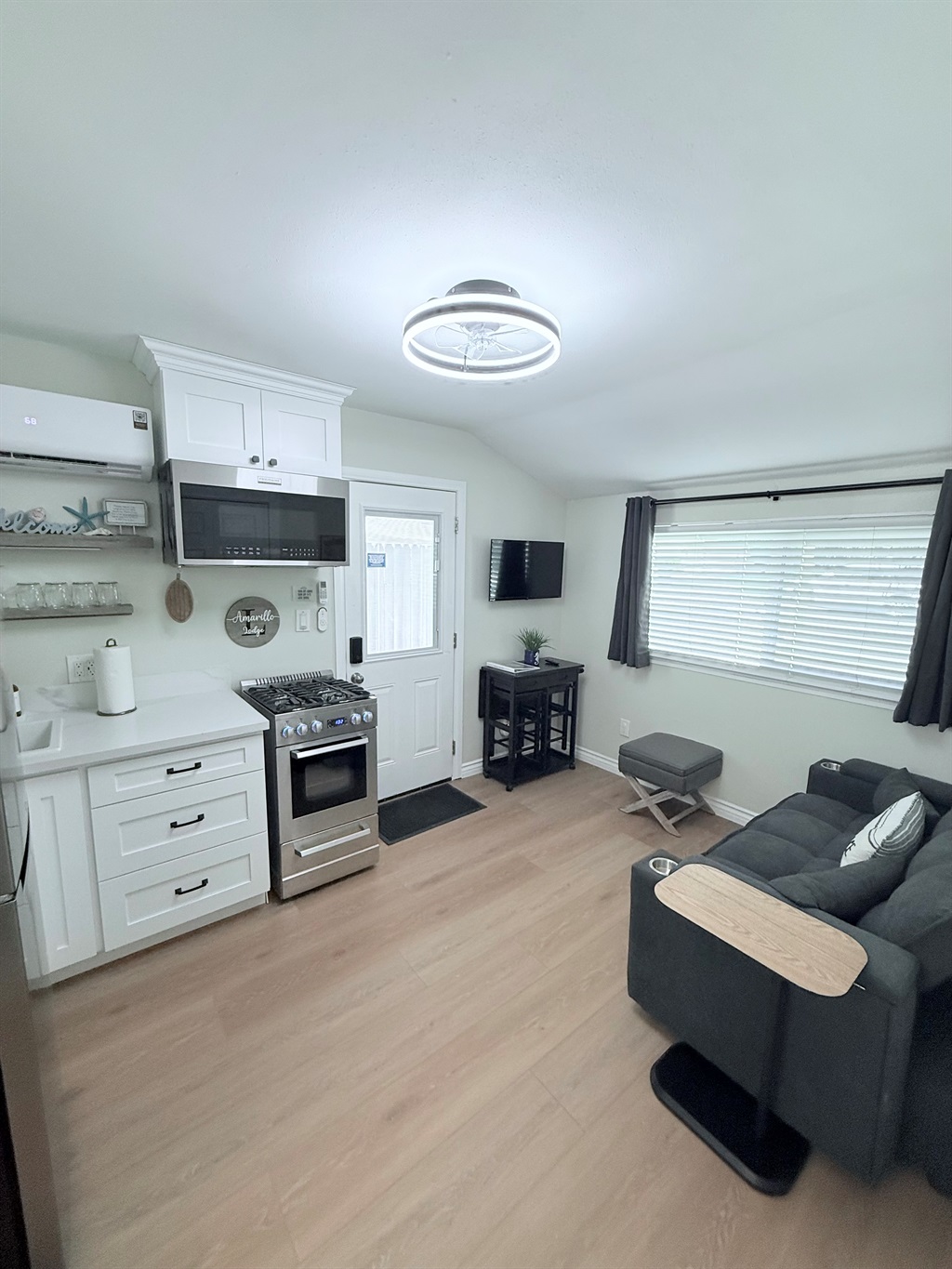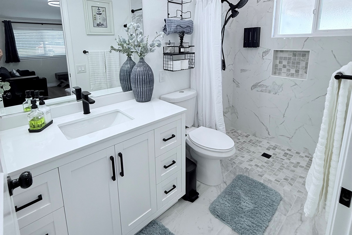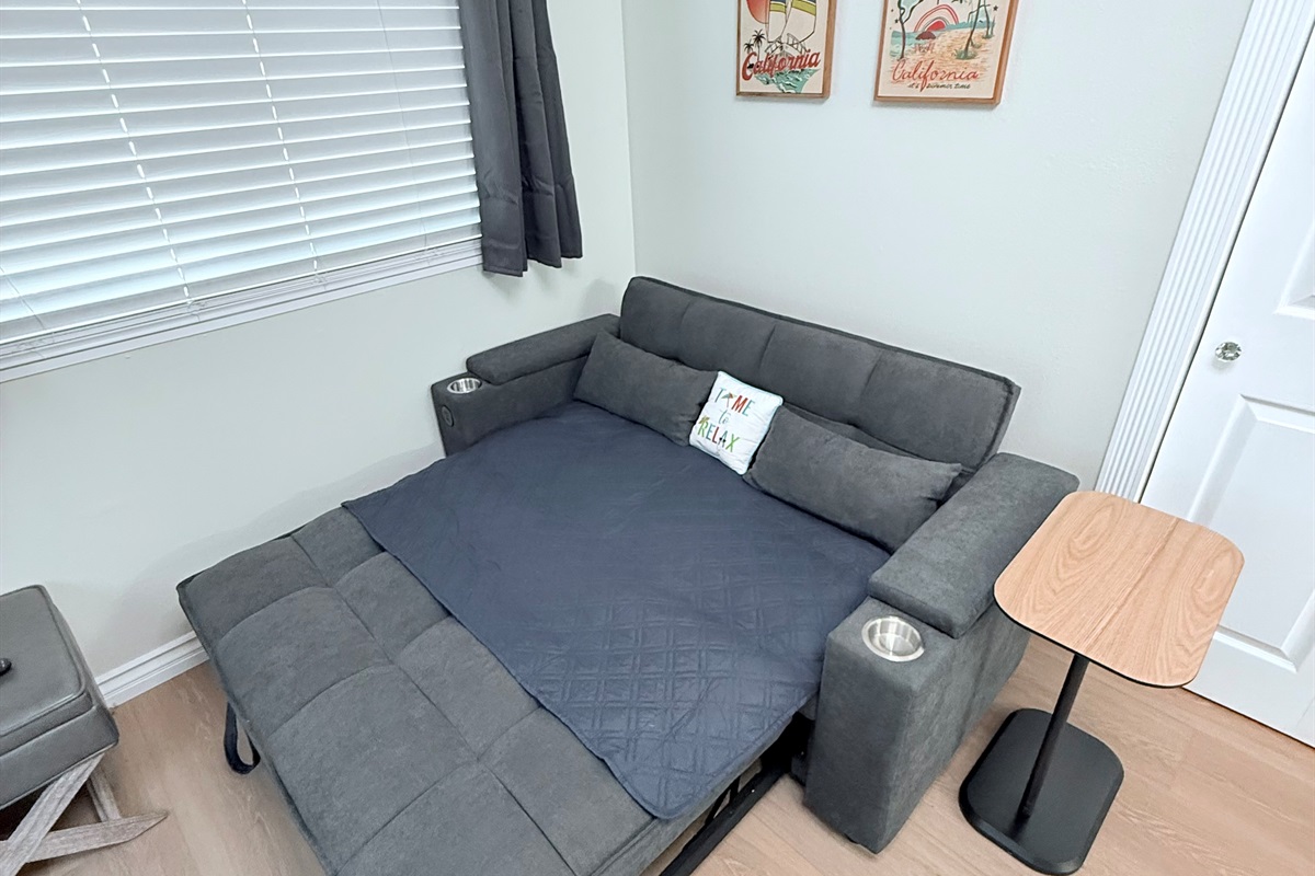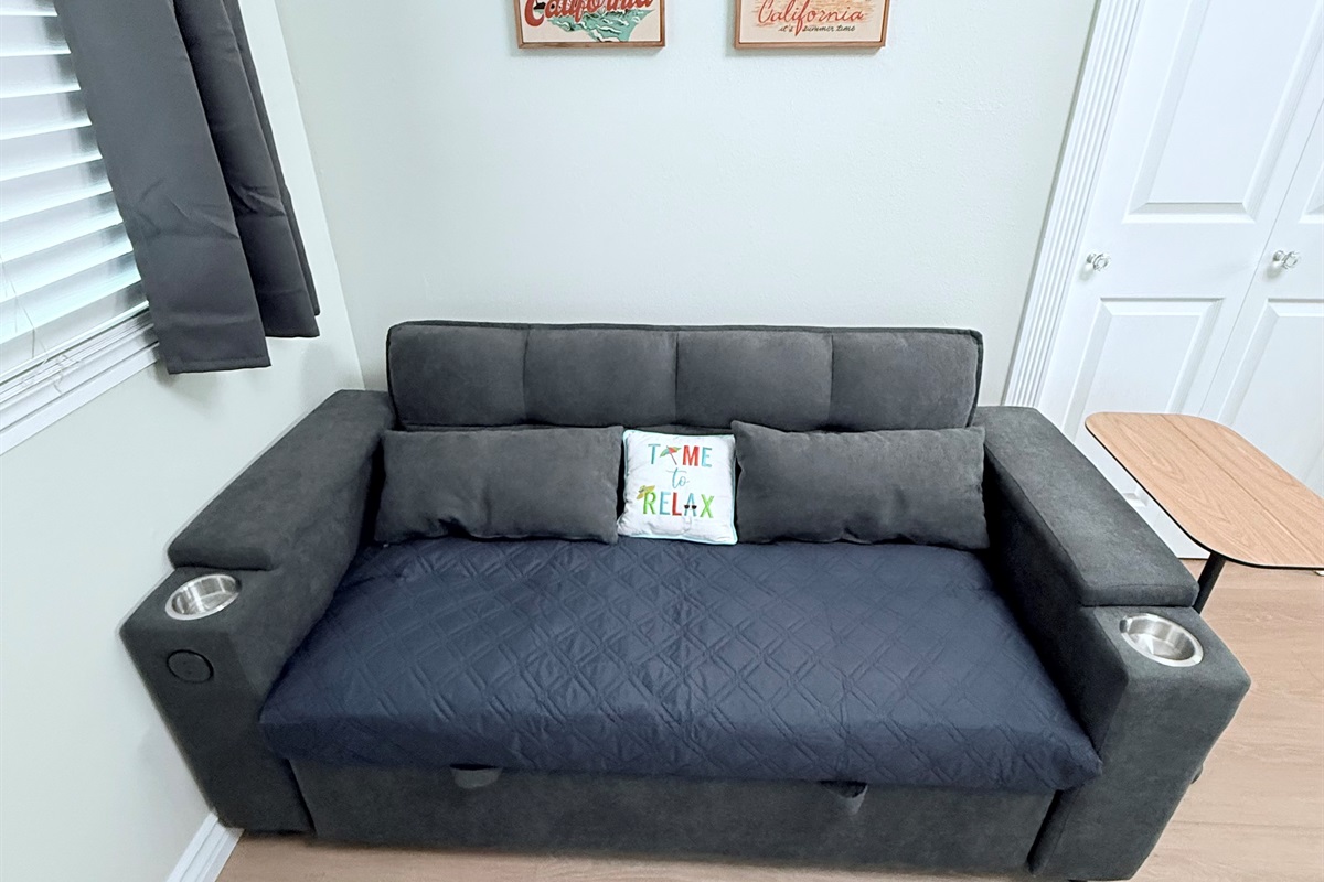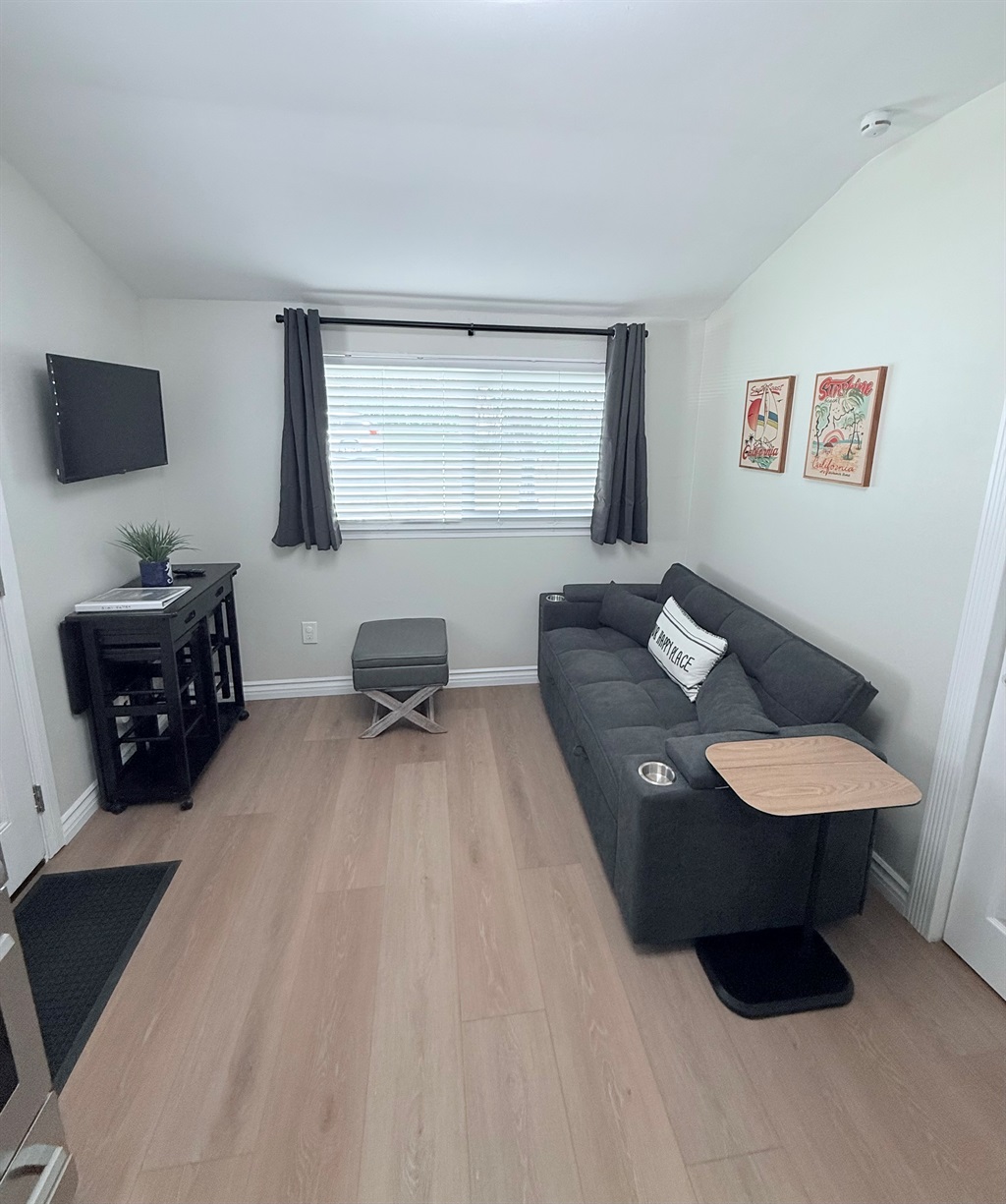 Inside, enjoy a fully stocked kitchen, cozy fireplace, fast Wi-Fi, and smart TVs in both the living room and bedroom. The spacious bedroom features a plush queen bed, while the living area offers a pull-out sofa, perfect for couples, small families, or business travelers. The modern bathroom boasts a sleek, curb-less walk-in shower for a touch of luxury.