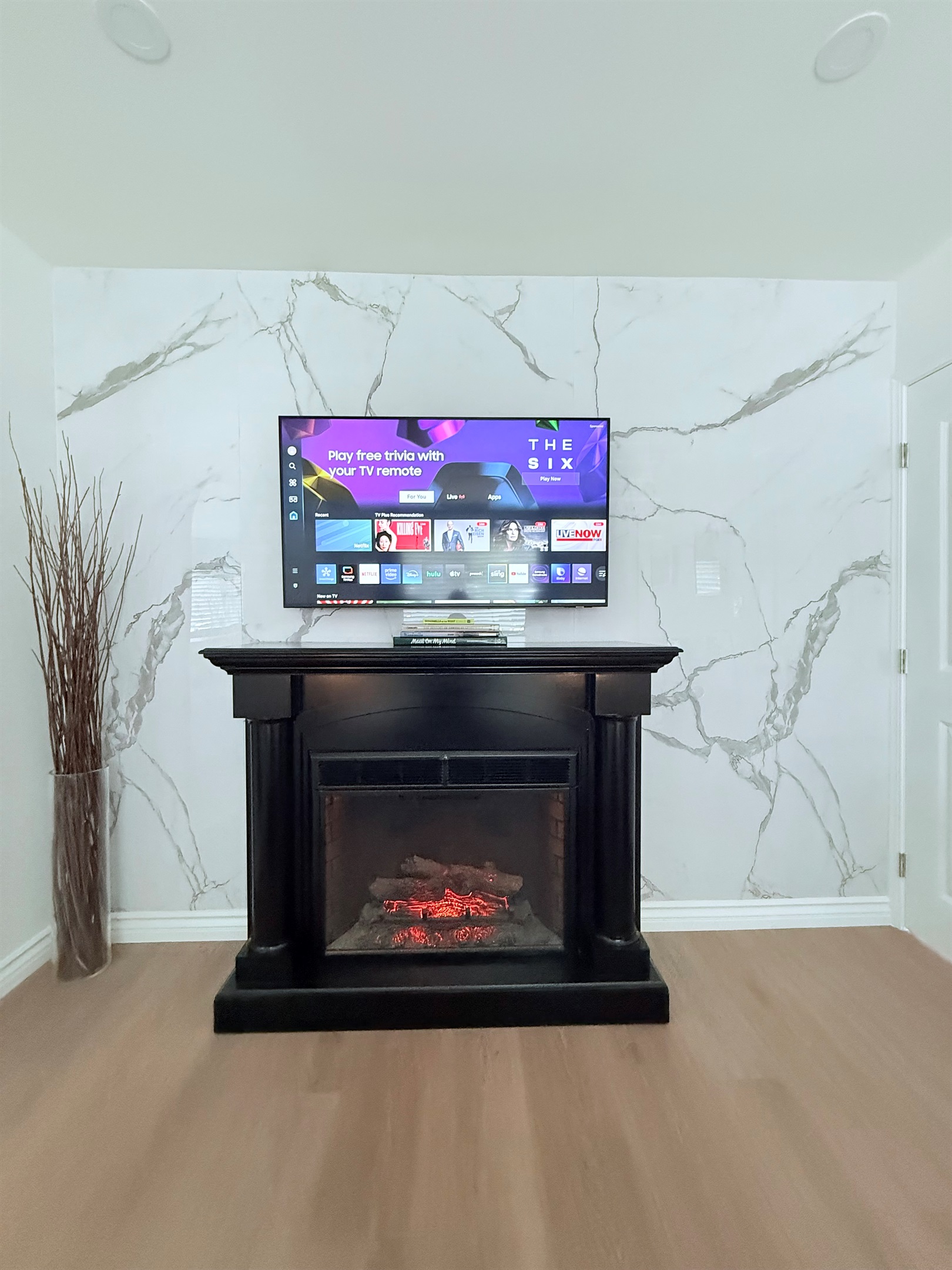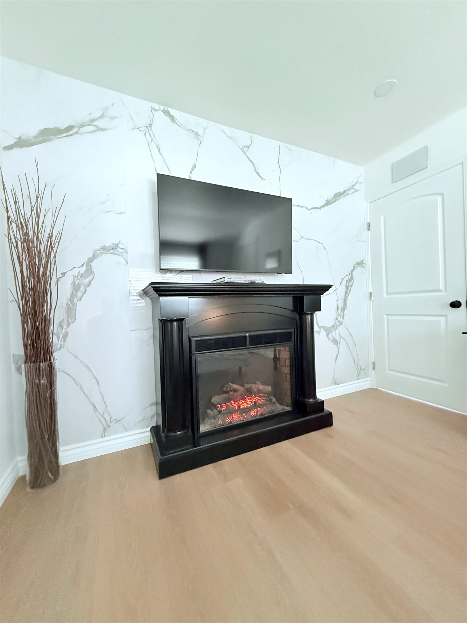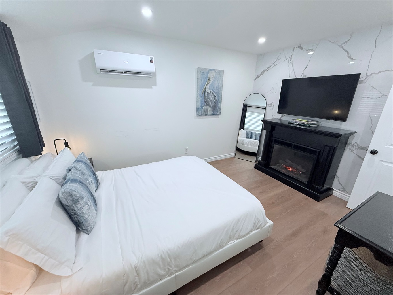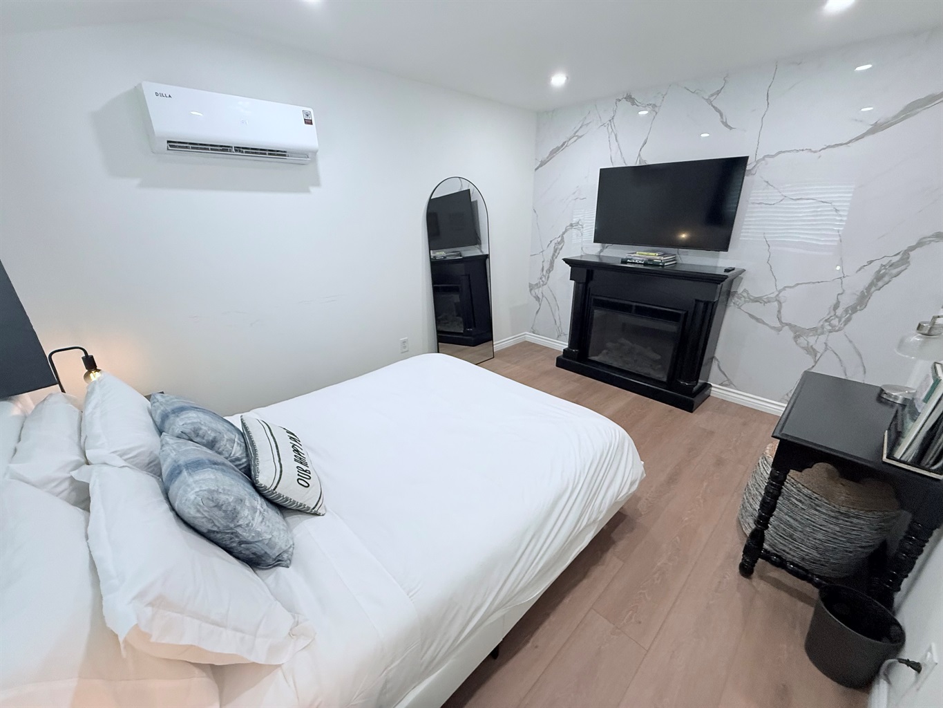 Inside, enjoy a fully stocked kitchen, cozy fireplace, fast Wi-Fi, and smart TVs in both the living room and bedroom. The spacious bedroom features a plush queen bed, while the living area offers a pull-out sofa, perfect for couples, small families, or business travelers. The modern bathroom boasts a sleek, curb-less walk-in shower for a touch of luxury.