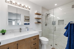 Step inside to a bright, open-concept living space with modern finishes and a welcoming feel. Unwind in the comfortable living area, where you can stream your favorites on the smart flat-screen TV. The full kitchen is perfect for preparing delicious meals and gathering together.