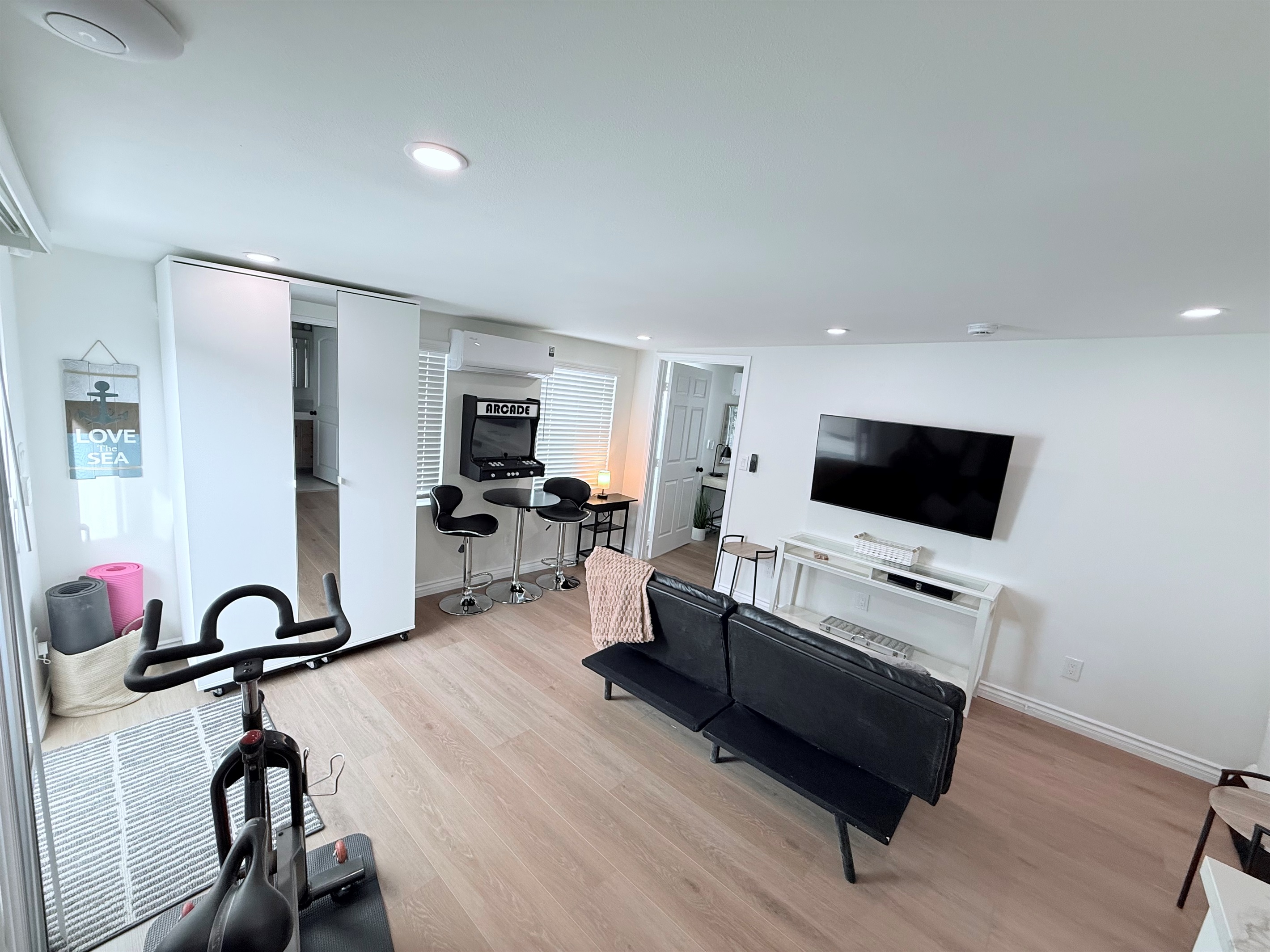Living Area: A comfortable and modern living space featuring an inviting electric fireplace for a cozy ambiance.