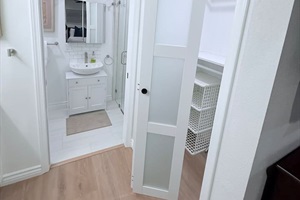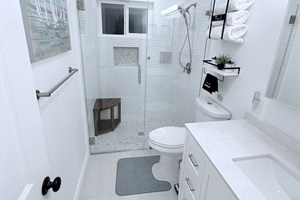 Primary Bedroom: Features a queen bed, a large smart TV, a dedicated workspace, and an en-suite bathroom with a modern, spa-style walk-in shower.